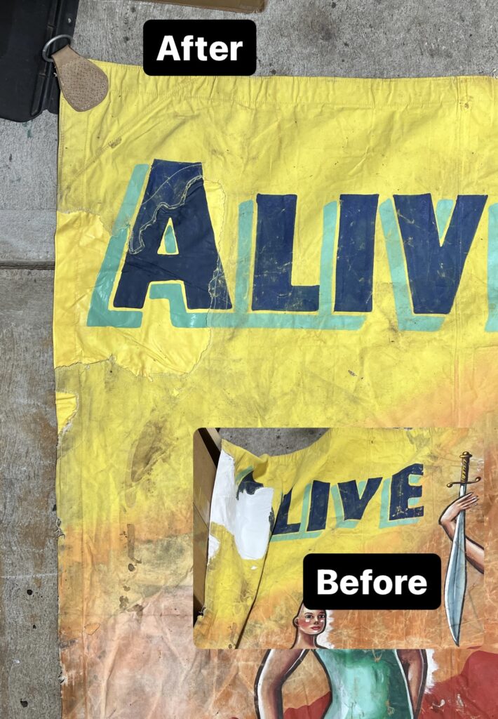 Sideshow banners live a crazy life and come in various conditions, many times with holes, rips and tears in the canvas. At Sideshow Banner Exchange, we take pride in our ability to stabilize and preserve banners so they can exist for as long as possible.