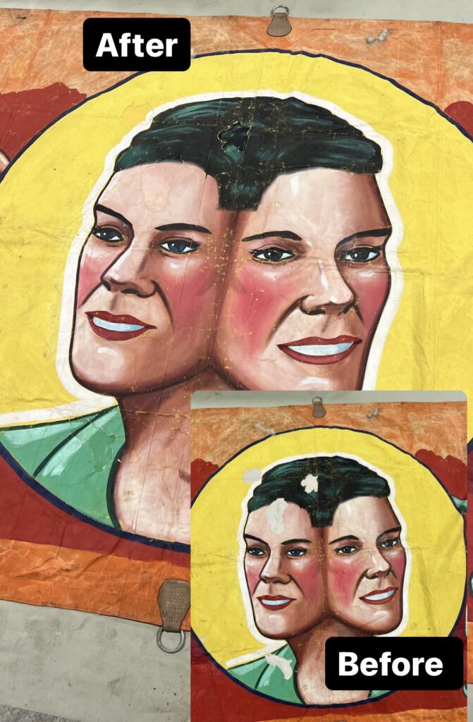 The below banner had over 20 holes in the canvas and only one was patched before it came to us. Some holes were as large as soccer balls. After careful patching and in-painting, the banner was properly restored back to what it once was.